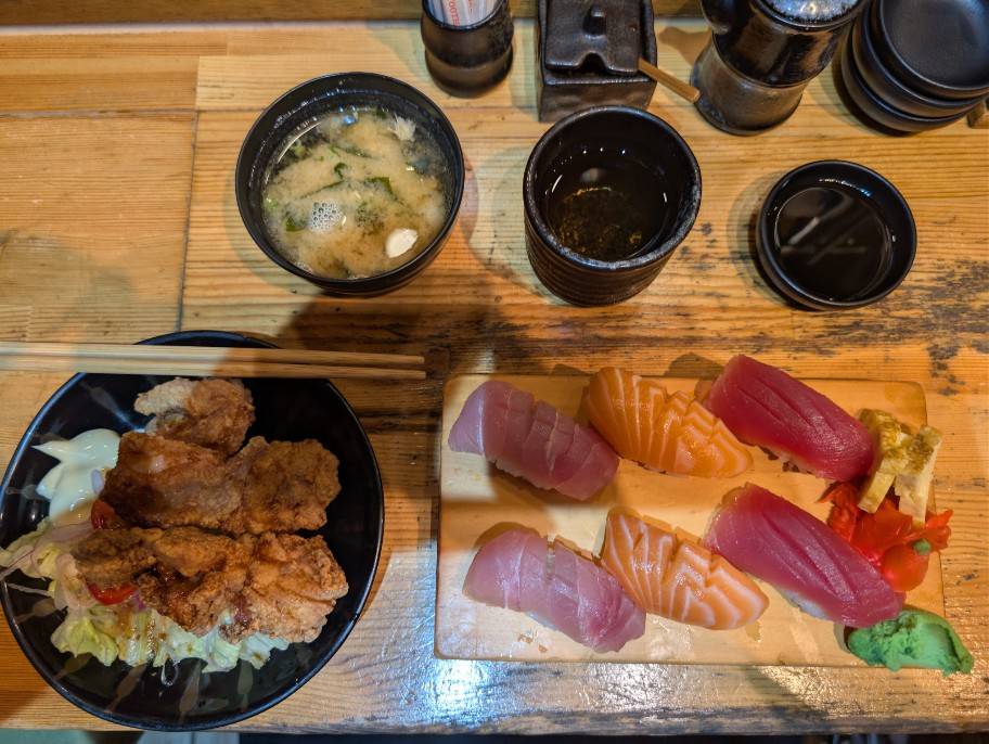 供應許多日式特色料理,壽司、麵飯、湯、酒通通有
