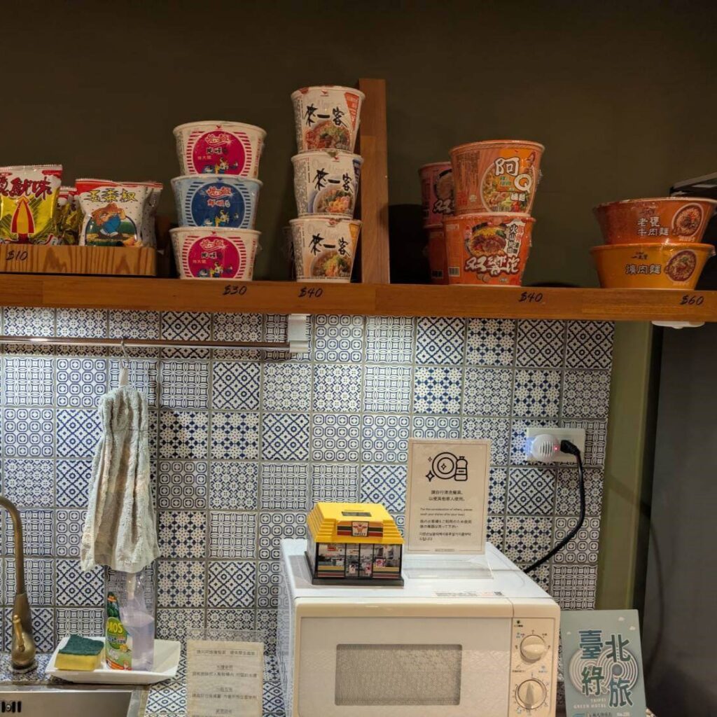 公共空間有誠實商店,多種泡麵、茶包、飲水機、餐具可使用