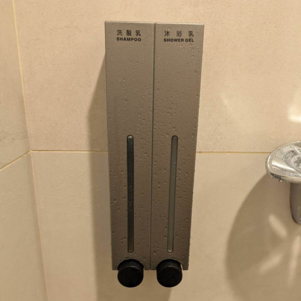 有提供壁掛式的沐浴洗髮乳,洗完後也很清爽不滑膩,入住可以減少攜帶很貼心