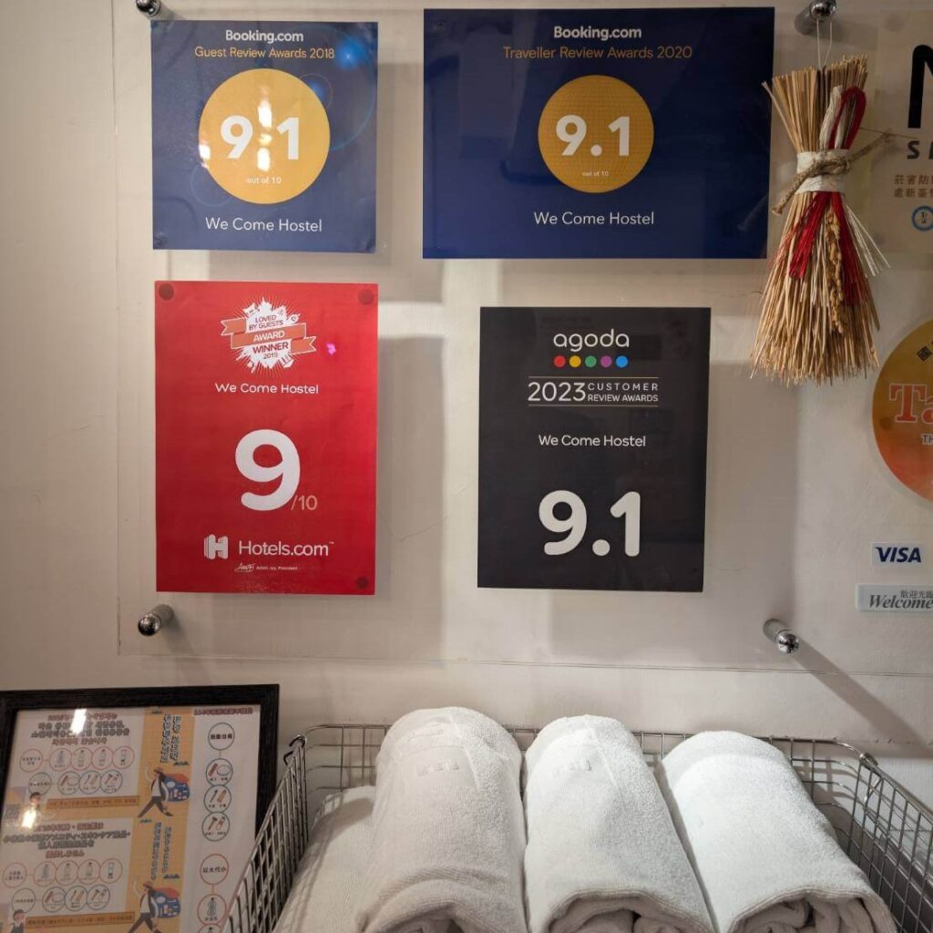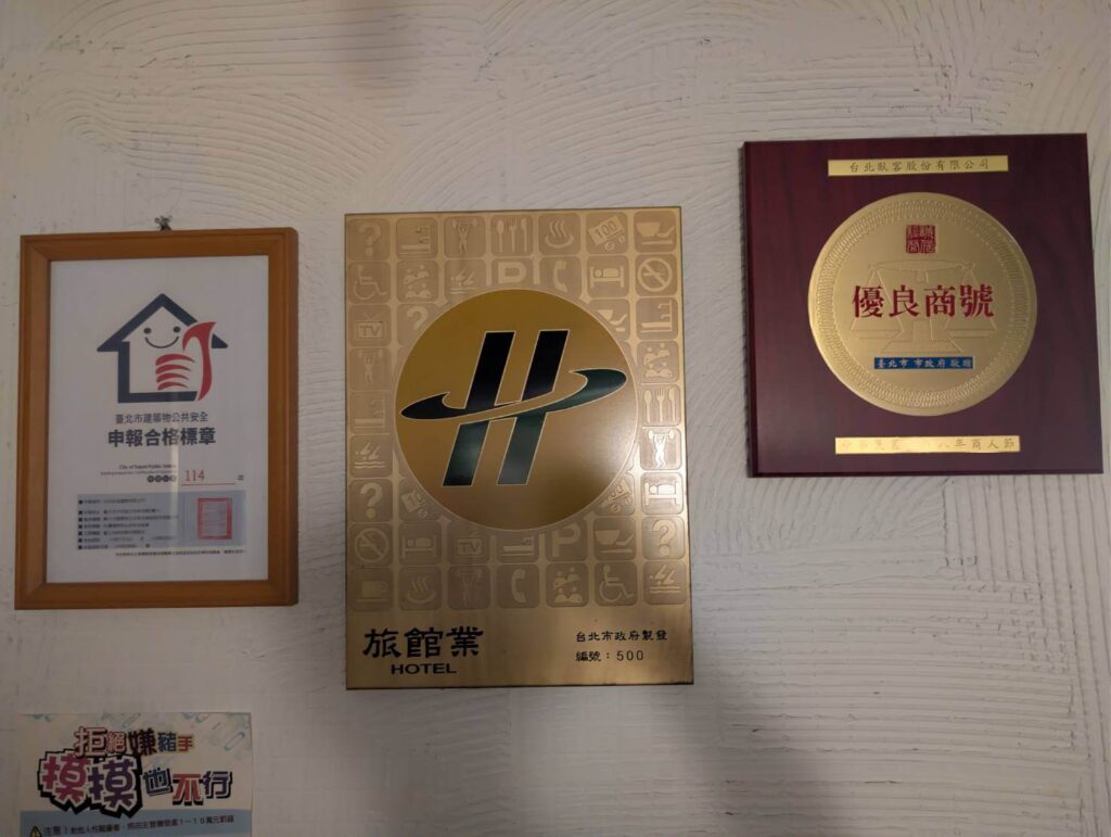 牆壁上掛著台北市政府頒發的合格旅館業及優良商號,在各大訂房網也有很高的評分